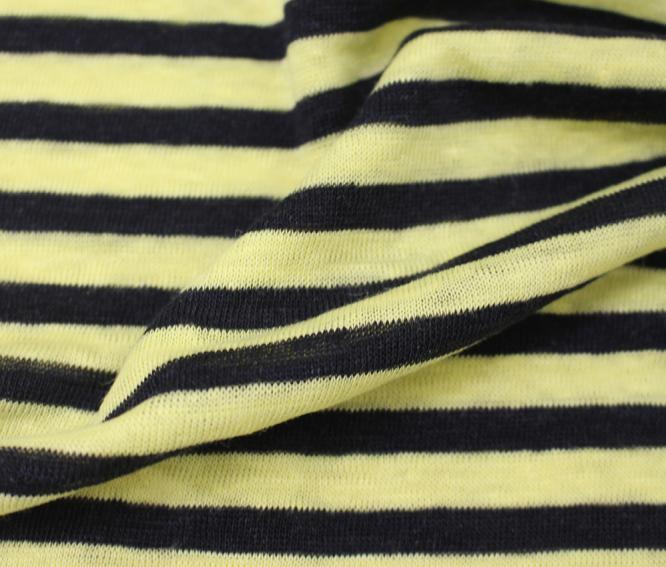Pruhovaný úplet Jersey:Tkanina má hladkou, mírně pružnou strukturu úpletu se střídajícími se pruhy, což zajišťuje estetický vzhled i pohodlí. Žerzejová konstrukce je ideální pro volné, ležérní oděvy.